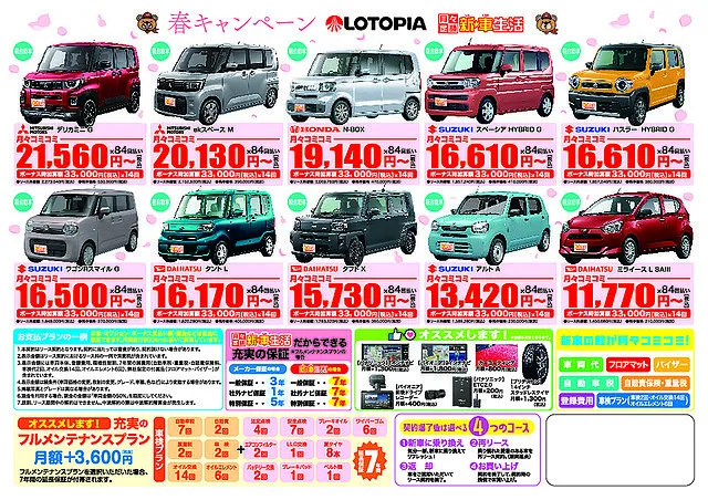 カーサポート高橋のマイカーリースは株式会社ロートピアが行うカーリース商品です。マイカーリースは車両代のほか基本的な維持費もコミコミで、7年間月々定額で新車に乗ることができます。